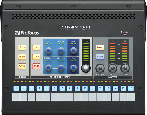 Der PreSonus EarMix 16M Personal Monitor Mixer bietet 16 monophone Eingangskanäle über den AVB-Netzwerkanschluss und wurde für die nahtlose Zusammenarbeit mit der PreSonus StudioLive Series III Mixer-Familie entwickelt, ist aber auch mit anderen AVB-fähigen Systemen kompatibel. Über den Aux-Eingang lässt sich der lokalen Mischung eine externe Quelle zumischen. Das System bietet verlinkbare Stereokanäle und Kanalgruppen, einen 3-Band-EQ und einen Limiter in jedem Kanal sowie der Summenmischung, symmetrische 6,35 mm TRS-Klinkenausgänge (L/R) und einen pegelstarken, transparenten Kopfhörerverstärker für niederohmige Geräte wie beispielsweise hochwertige In-Ear-Monitorsysteme. Zwei AVB-Ports ermöglichen, mehrere Geräte in Reihe zu schalten, sodass sich maximal 24 Systeme mit einem StudioLive Series III Mixer vernetzen lassen. Der EarMix 16M kann wahlweise mit dem Netzteil aus dem Lieferumfang oder einen kompatiblen Switch vorausgesetzt über PoE (Power over Ethernet) mit Strom versorgt werden.
