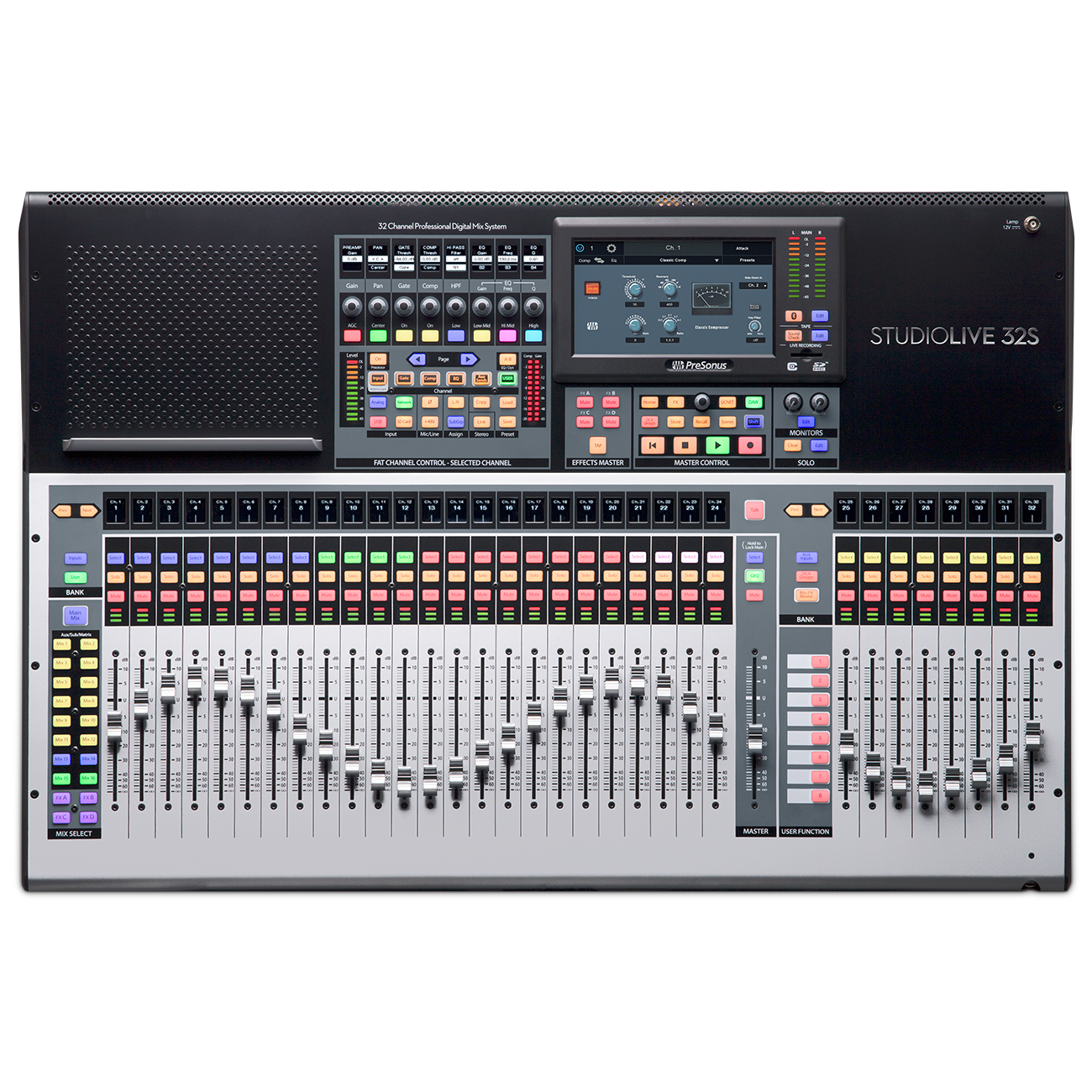 Mit dem StudioLive® 32S präsentiert PreSonus® einen kompakten Digitalmixer mit effizientem 1:1-Bedienkonzept, flexiblen Routing-Optionen und Erweiterungsmöglichkeiten, AVB-Netzwerkfunktion und 128 (64x64) Aufnahmekanälen über USB sowie den integrierten SD-Karten-Recorder.