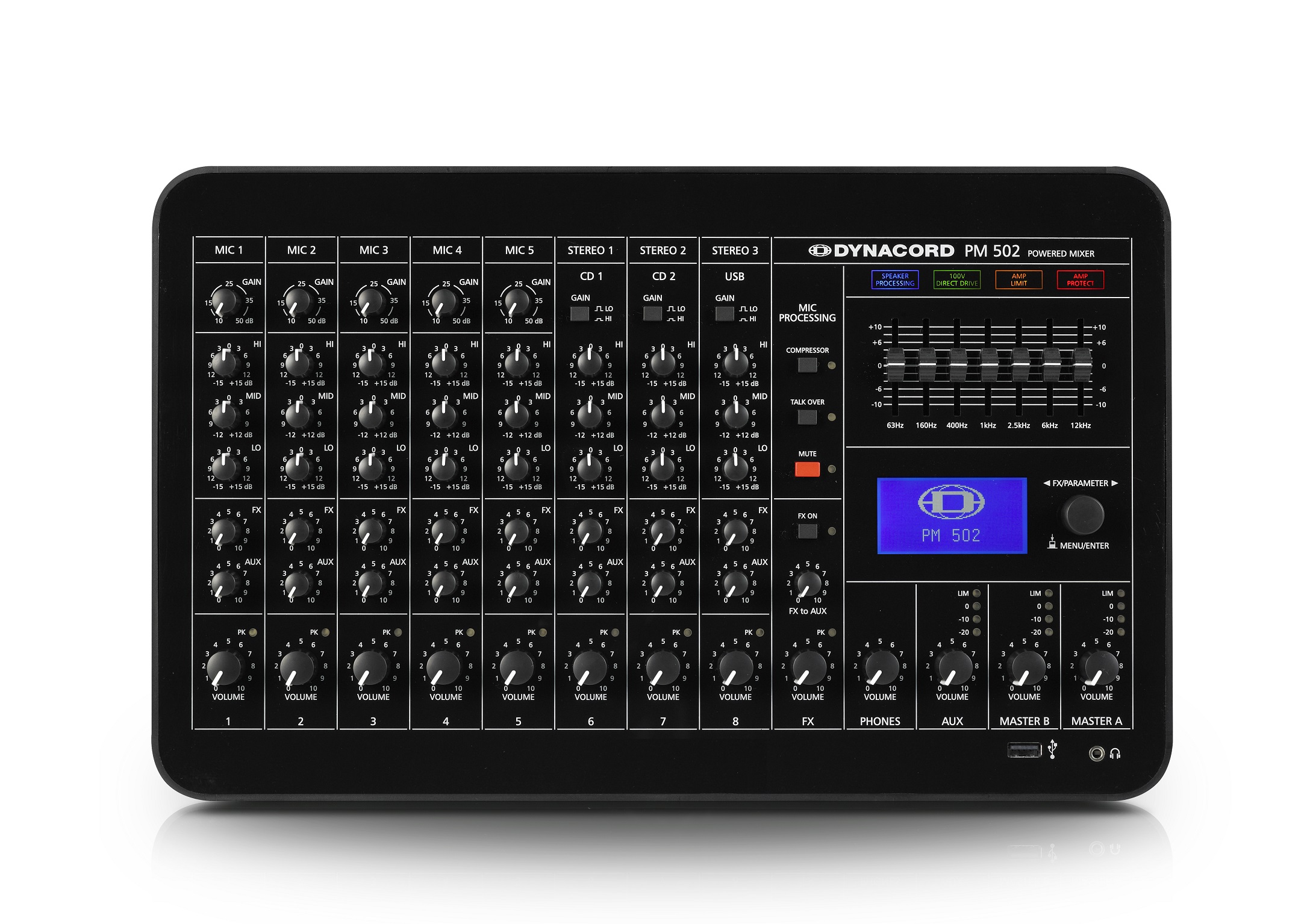 Verfügbar ab Mitte Mai 2014 Dieses innovative Produkt besticht durch seine moderne Erscheinung und sein benutzerfreundliches Design. Es verbindet feinste Analogtechnik mit allen Vorzügen einer digitalen Master- und Amp-Sektion, für eine neue Dimension an Flexibilität in dieser Klasse. Die klangliche Performance erfüllt selbstverständlich alle Erwartungen die Sie an ein Qualitätsprodukt aus dem Hause Dynacord stellen. Seine Ausstattung umfasst : 5 MIC/LINE Eingangskanäle mit Compressor /Limiter und Talk-over-Funktion, 3 Stereo Eingangskanäle mit Klinken, Cinch und USB Anschlüssen, Audio Player für MP3 oder WAV Dateien, hochwertige Effektsektion mit 32 editierbaren Presets, 3 Master Ausgänge mit je einem 7-Band EQ und flexiblem Routing, Delay Line für Master-B (150 msec / 50 m), Kopfhörerlautstärke, LPN Speaker-Processing, Class-D 2 x 450 W RMS / 2 x 600 W / 4 Ohm IHF-A Power, Microcontroller-geregeltes Netzteil (100V 240V), Direct-Drive Option für 100V-Linien, umfangreiches Schutzschaltungspaket, Anschlüsse für Live- und Installationsanwendungen, optionaler Rackmontagesatz. Der PM 502ist sehr vielseitig und empfiehlt sich für eine ganze Reihe von Installations- und Liveanwendungen. Die Eingangsstruktur in Verbindung mit der Ausstattung und den Anschlussmöglichkeiten machen den PM 502 zum Herzstück vieler Installationen, von Bistros und kleinen Clubs, Lounges, Boutiquen, Hotel Bars und Lobbys bis hin zu Kirchen, Moscheen und weiteren, ähnlichen Anwendungen. Der integrierte MP-3 Player ermöglicht sehr einfach das Abspielen von auf einem USB Stick oder einer Festplatte gespeicherten Audioaufnahmen. Darüber hinaus bietet er eine exzellente Wahl für Entertainer, DJs und kleine Bands, die nach einer leichten und kompakten Lösung für Bühne und Proberaum suchen.
