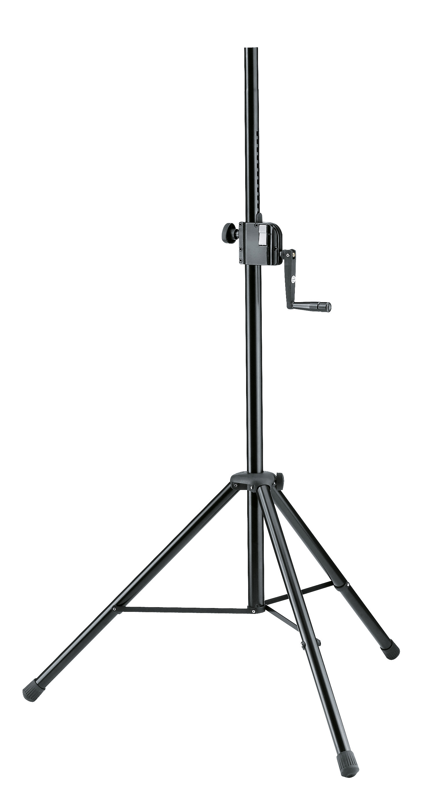 Hochwertiges Boxenstativ aus Stahl mit Kunststoffschellen für den professionellen Einsatz. Die stufenlose Höhenverstellung erfolgt bequem und sicher mittels Kurbel und Drucktaste, die einen unkontrollierten Rücklauf verhindert. Eine zusätzliche Sicherungsschraube sorgt für sicheren Halt. Auszugsrohr-Ø 35 mm, passend für Boxen sowie Leuchtentraversen durch eingepresste Gewindebuchse M10.