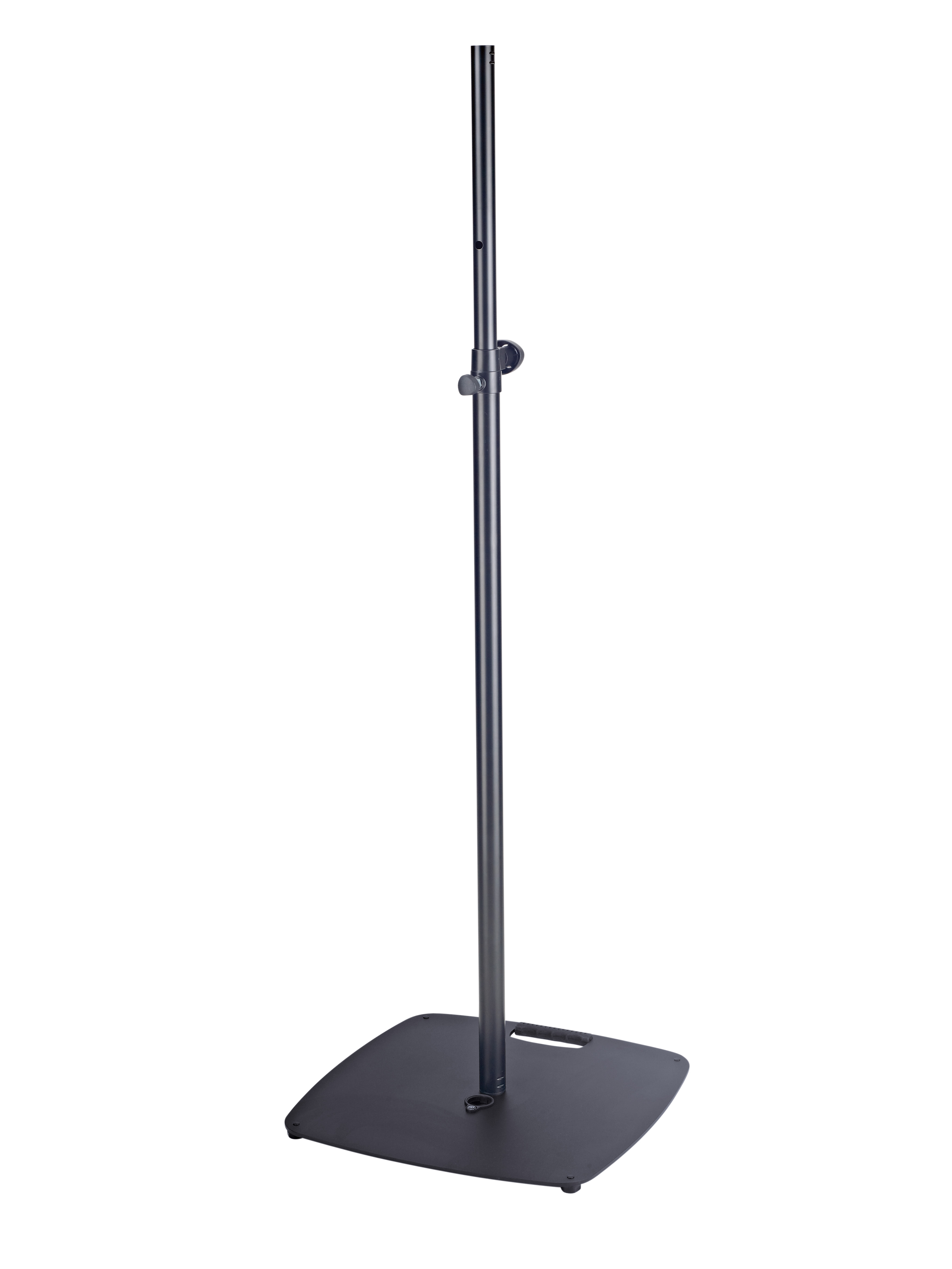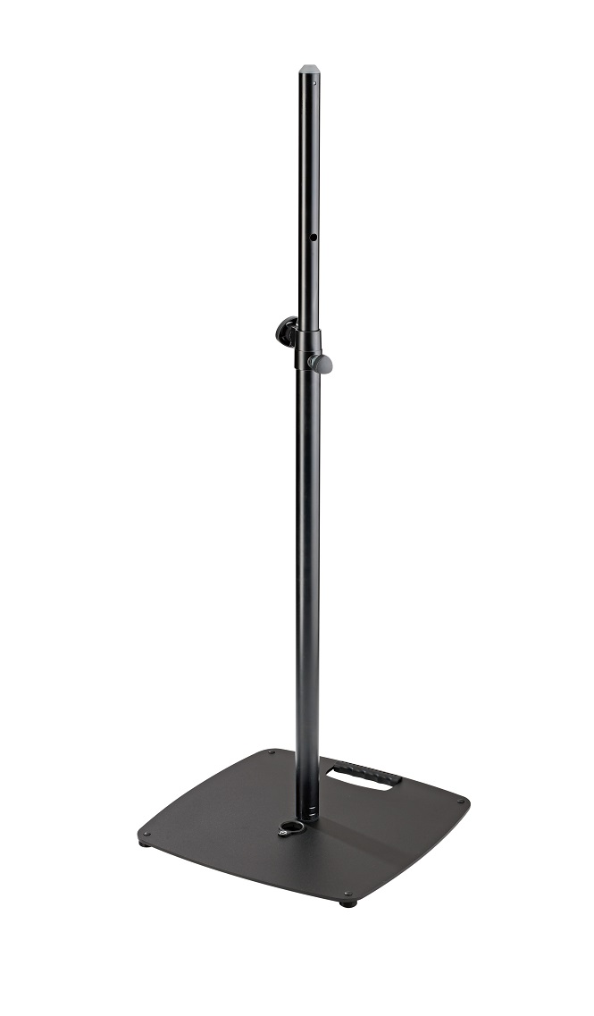 Stabiles Boxenstativ mit flacher Sockelplatte für den platzsparenden Einsatz. Die robuste Rohrkombination kann bis auf 1,81 m ausgezogen werden und Lautsprecherboxen bis zu 20 kg tragen. Der bewährte Rastbolzen mit der Sicherungsschraube ermöglicht eine komfortable und sichere Höhenverstellung. Die flache Stahlplatte sorgt für ausreichend Stabilität und fällt kaum auf. Ein praktischer Tragegriff, eine Kabeldurchführung sowie vier stabile Füße mit Filzüberzug bieten weitere nützliche Vorteile. Mit dem beigefügten Schlüssel kann die Rohrkombination individuell ausgerichtet werden. Technische Daten: