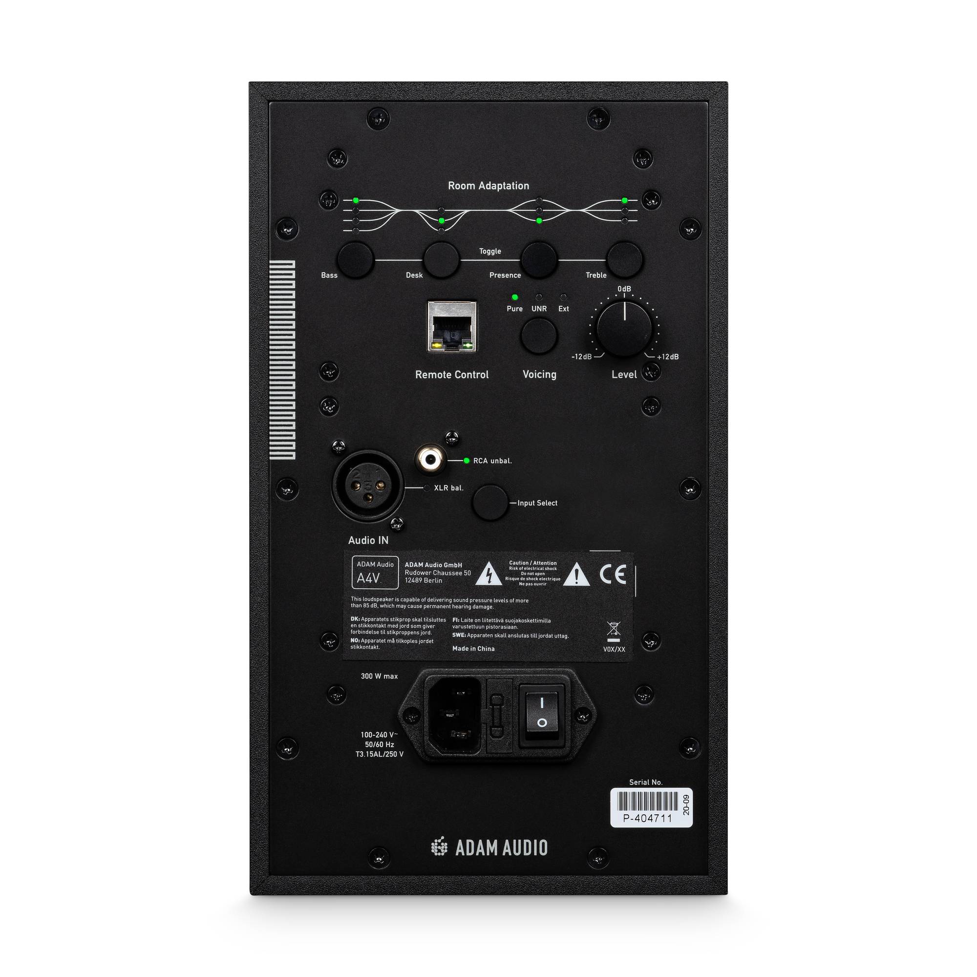 Optimiert für kleine Studioräume, kurze Abhördistanzen und immersive Mehrkanal-Wiedergabe, liefert der kompakte A4V überaus präzisen und druckvollen Sound. Auch dieser 2-Wege Lautsprecher nutzt ADAM Audios renommierten X-ART Hochtöner. Er ist mit einem 4-Zoll Tiefmitteltöner ausgestattet, dessen Membran – wie bei allen A-Serie Modellen – aus einem extrem leichten, jedoch äußerst stabilen Mineralfaser-Werkstoff (MLM) gefertigt wird. Dank DSP-Technologie liefert der A4V im Handumdrehen einen perfekten Sound in unterschiedlichsten Abhörumgebungen. Sein Frequenzgang von 53 Hz bis 42 kHz qualifiziert ihn für einen umfangreichen Anwendungsbereich – von der Podcast-Produktion bis hin zur Abmischung eines Streichquartetts. Darüber hinaus eignet sich der A4V perfekt für Mehrkanal-Systeme.