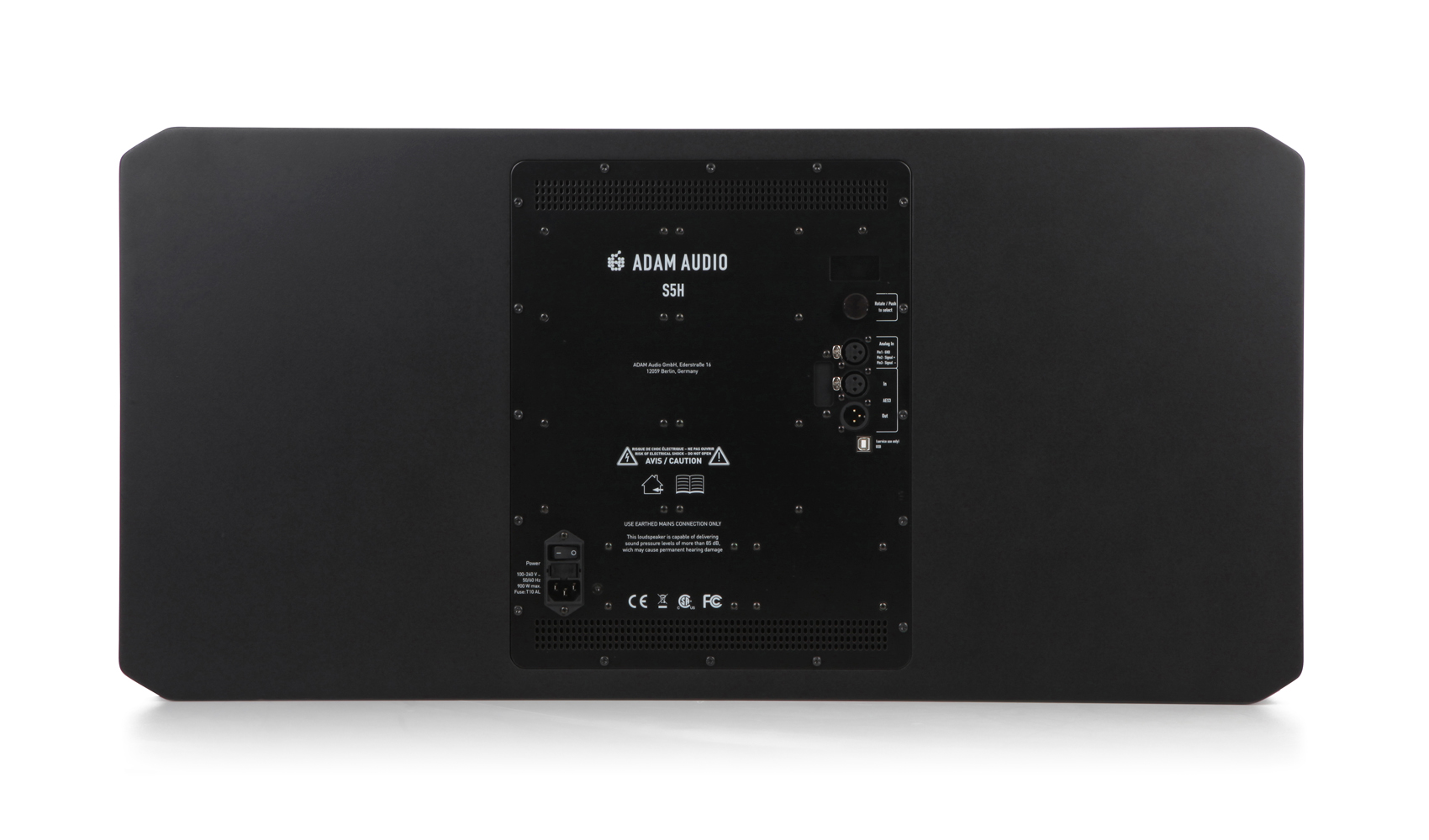 Der S5H ist ein eindrucksvoller Main-Monitor und damit auf die besonderen Anforderungen abgestimmt, die in großen Studios und Regie-Räumen zu finden sind. In einer horizontalen Konfiguration arbeitet ein 3-Wege-System mit zwei eigens für den S5H entwickelten 10-Tieftönern. Wie bei allen Woofern der S-Serie setzen wir auch hier auf die proprietären ELE und SMA-Technologien, die für eine straffe, verzerrungsfreie Wiedergabe der tiefen Frequenzen sorgen. Den kritischen Mittenbereich deckt der ebenfalls von ADAM Audio neu entwickelte, innovative 4-DCH-Mitteltöner ab, dessen Hybridbauweise die klanglichen Vorteile sowohl der Konus- als auch der Kalottentechnik in sich vereint. In Kombination mit dem nach neuentwickelten S-ART-Hochtöner wird ein maximal aufgelöstes Stereobild und Tiefenstaffelung mit einer kräftigen, völlig unangestrengten Wiedergabe erreicht. Die Abstrahlcharakteristik der Mittel- und Hochtöner wird durch die aus einem Stück Aluminium gefrästen MPS und HPS-Waveguides optimiert und erlaubt das Arbeiten von mehr als einer Person im Sweet-Spot nebeneinander, was gerade in größeren Regie-Räumen häufig der Fall ist. Das eigens für die S-Serie entwickelte DSP-Board beinhaltet eine perfekt abgestimmte Frequenzweiche für einen extrem linearen Frequenzgang. Des Weiteren erlauben zwei parametrische Niveaufilter (einen für den Bass, einen für die Höhen) sowie sechs weitere voll parametrische EQs mit variabler Steilheit eine Anpassung des Monitors an den Raum bzw. individuelle Präferenzen. Darüber hinaus bietet der DSP limiter-basierte Schutzmechanismen für den Hochton-Verstärker, digitale AES3-Eingänge und diverse Möglichkeiten für zukünftige Erweiterungen. Software-Updates und eine digitale Ansteuerung über den Computer erfolgen ganz einfach über den USB-Port. Insgesamt vier Aggregate versorgen die einzelnen Treiber: zwei 700 W PWM-Verstärker für die Tieftöner, ein 300 W PWM-Verstärker für den Mitteltöner und 100 W A/B-Verstärker für den S-ART-Hochtöner. Mit seinen innovativen Features, dem fortschrittlichen Design, den großzügigen Leistungsreserven und dem enormen Dynamikumfang ist der S5H das neue Flaggschiff von ADAM Audio: Ein außergewöhnlicher Studio-Monitor, der Audiowiedergabe auf höchstem Niveau ermöglicht.