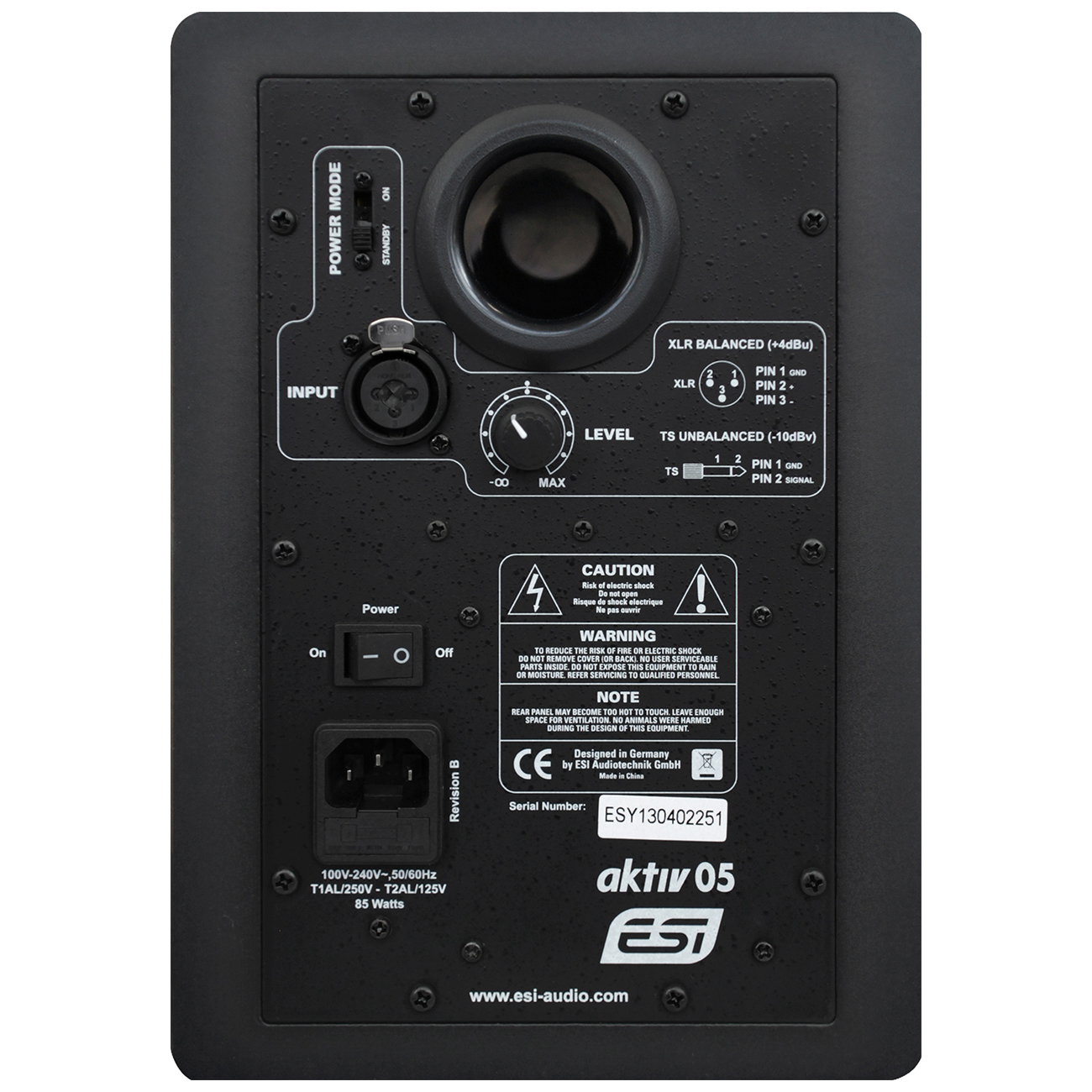 Bei den Lautsprechern setzt die aktiv 05 konsequent auf bewährte Komponenten: der 5-Tieftöner hat eine unverwüstliche Kevlar®-Membran - ein Material, was üblicherweise nur bei bedeutend teureren Monitoren zum Einsatz kommt -, die für eine impulstreue, knackige und stets trockene Basswiedergabe sorgt. Der Frequenzgang reicht dabei bis 50 Hz herunter; wem das nicht genügt, kann die Abhöre mit dem perfekt passenden ESI-Subwoofer aktiv 10s zu einem mächtigen 2.1-System erweitern.