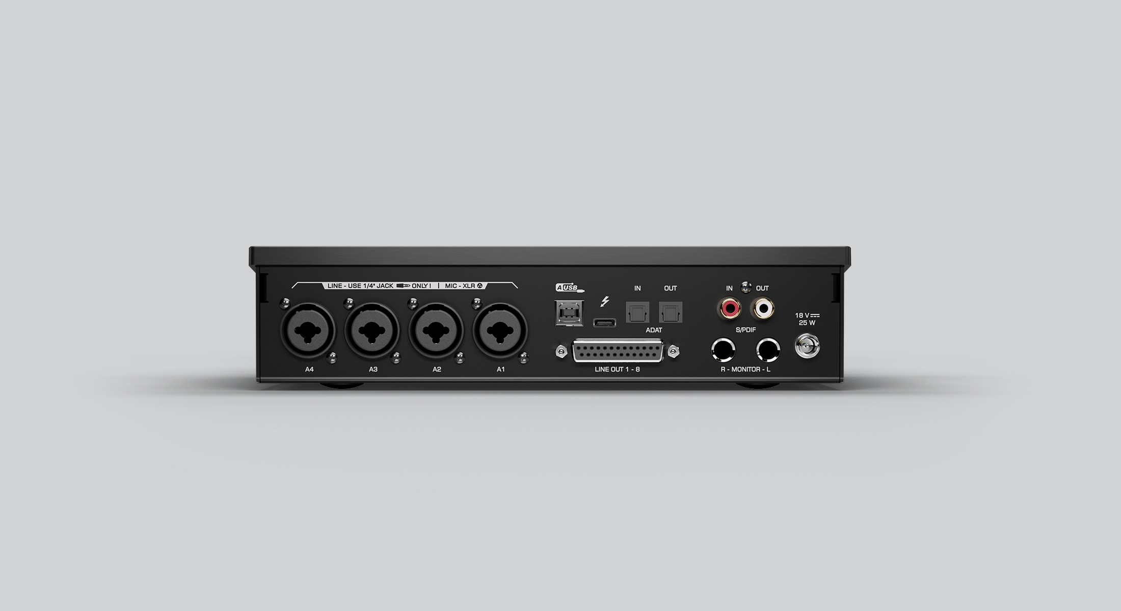 • 4 Mikrofon, 8 Line- und 4 Hi-Z Eingänge, 8 Line- und 2 Reamping-Ausgänge
