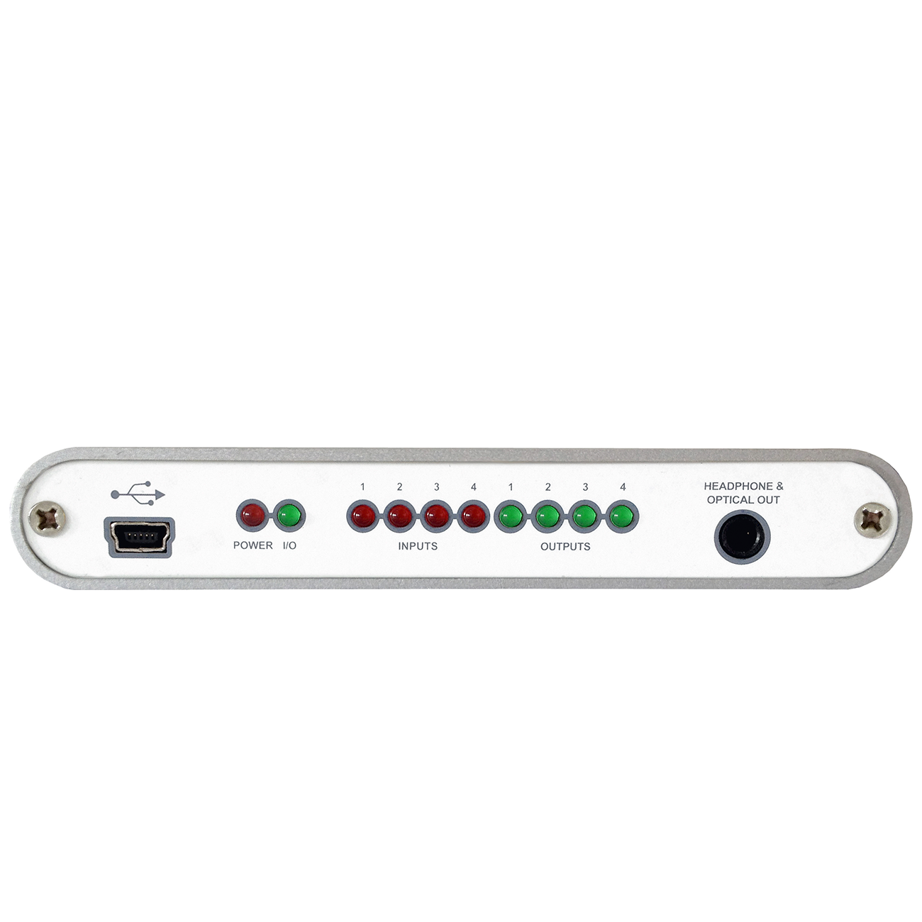 Ein mit 12 cm Breite sehr kompakte externe Soundkarte mit 4 Line-Eingängen und 4 Line-Ausgängen auf der Rückseite, alle als Cinch-Buchsen ausgeführt. Der Nennpegel liegt bei typischen -10 dBV. Frontseitig ist rechts der Kopfhöranschluss mit seiner 3,5 mm Miniklinkenbuchse, die bei Bedarf auch als optischer S/PDIF-Ausgang dienen kann. Links sind der USB-Port sowie daneben 10 LEDs als Betriebs- und Signalanzeige.