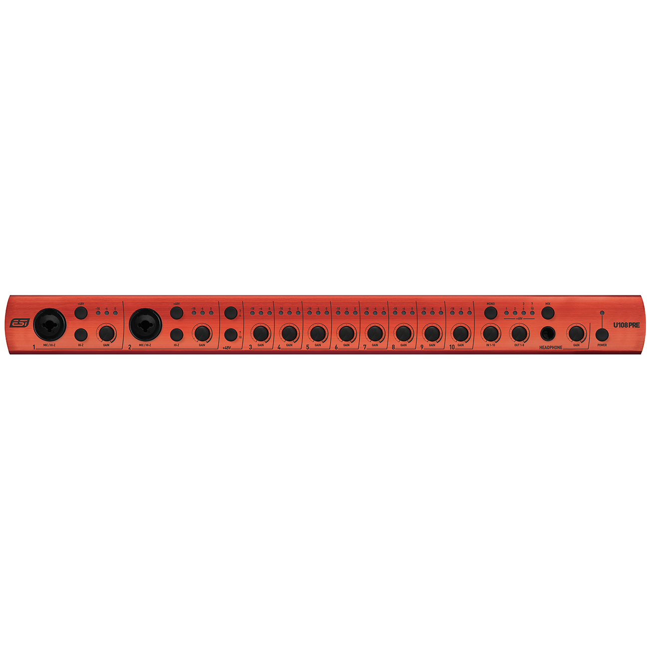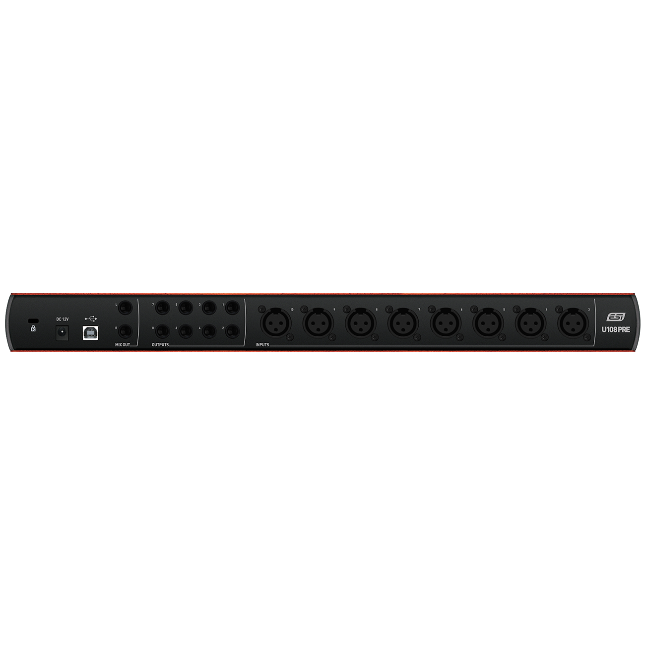 Das perfekte Audio-Interface für jeden, der mit bis zu zehn Mikrofonen gleichzeitig aufnehmen möchte. Bewusst wurde bei U108 PRE auf Line-Eingänge verzichtet. Dafür hat man frontseitig zwei Combo-Buchsen, an die man auch hochohmige Instrumente wie E-Gitarre oder E-Bass anschließen kann, plus weitere 8 XLR-Mikrofoneingänge auf der Rückseite. Alle können mit 48 V Phantomspeisung versorgt werden, diese lässt sich für die Eingänge 1, 2, 3-6 und 7-10 separat zuschalten.