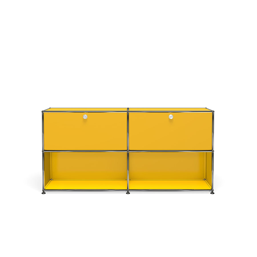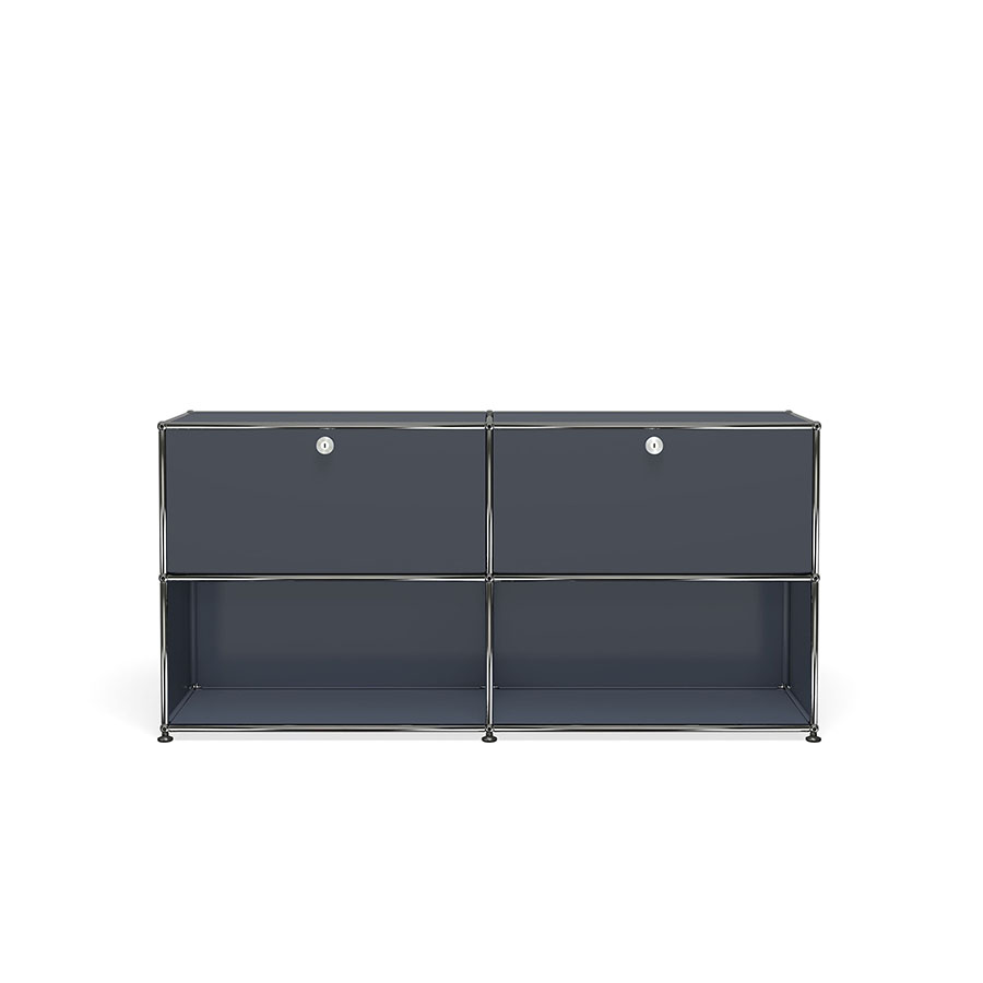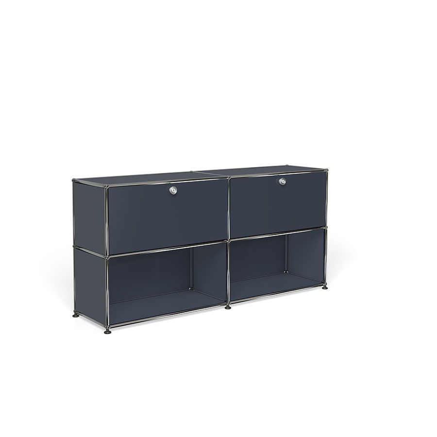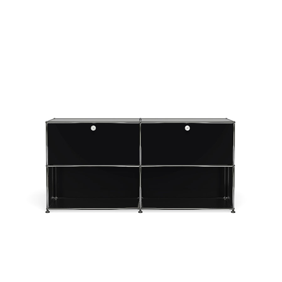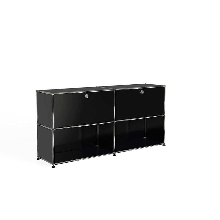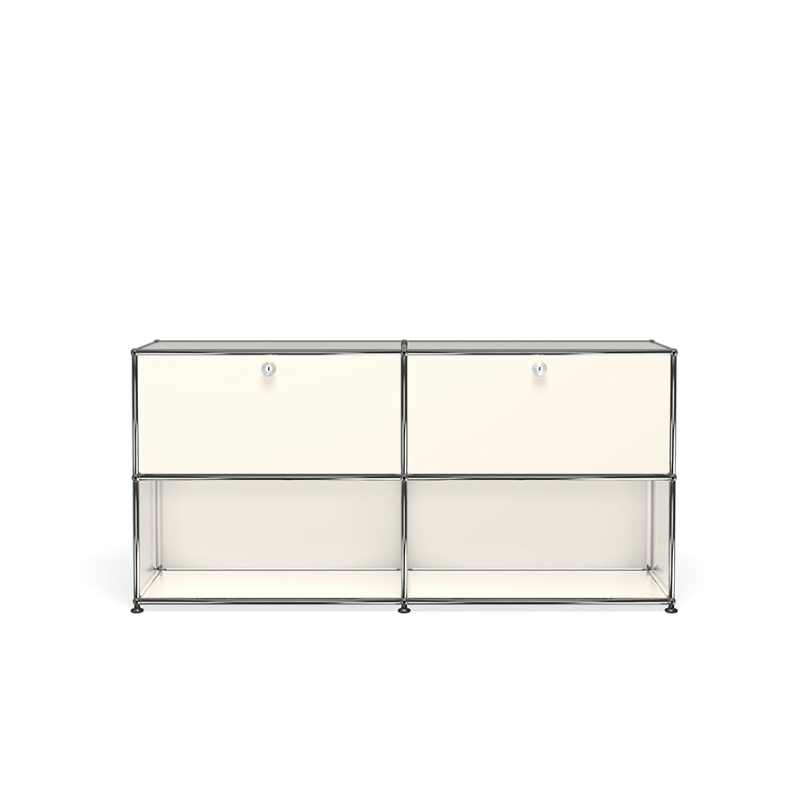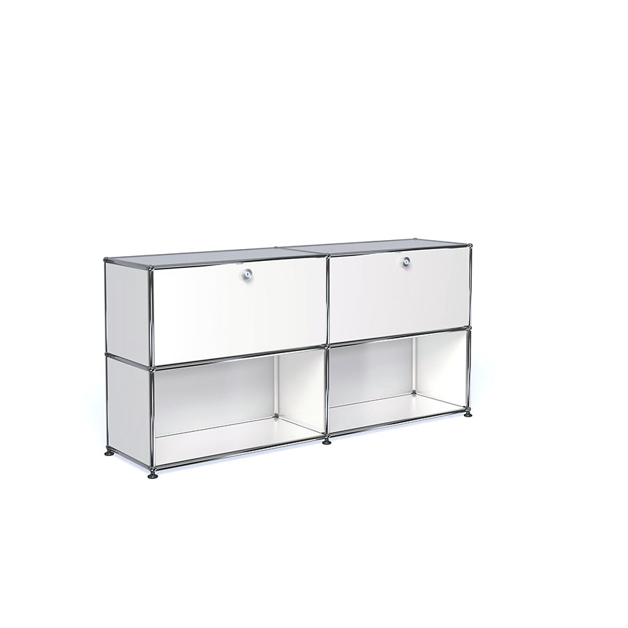 Diese USM Haller Anrichte mit zwei Klapptüren vereint geschlossenen Stauraum mit einem offenen Regal. Aus Stahl und erhältlich in fünf Farben. Ein unaufdringlicher Design Klassiker.