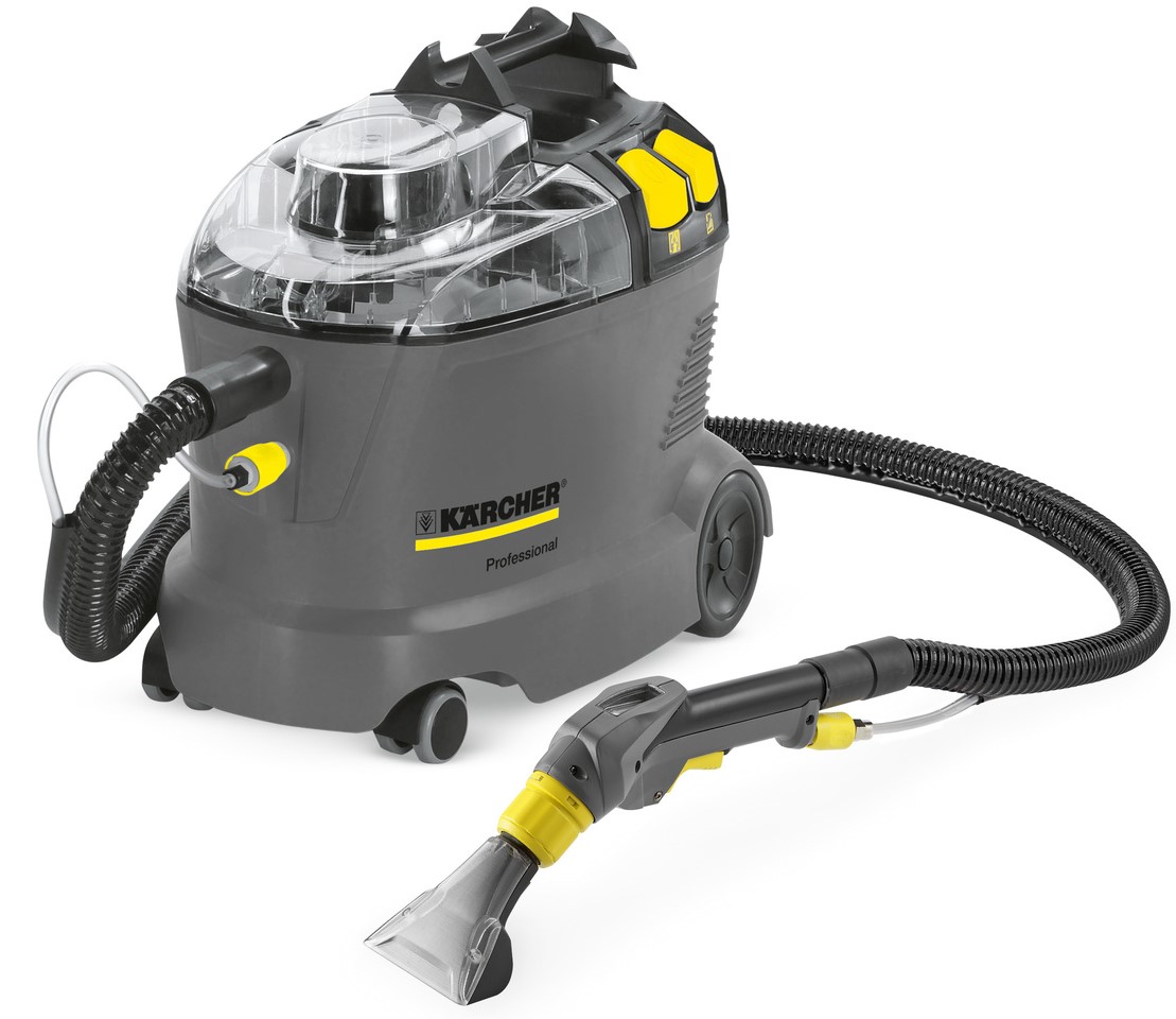 Kraftvolles und kompaktes Sprühextraktionsgerät für kleine Teppichbodenflächenreinigung. Es bietet das beste Rücksaugergebnis von allen vergleichbaren Wettbewerbsgerät. Das Puzzi 8/1 C ermöglicht eine schnelle Wiederbegehbarkeit der textilen Flächen. Das Netzkabel kann am ausklappbaren Kabelhaken positioniert werden. Integrierte Bodendüsenhalterung am Gerät. Geringes Gewicht Das Puzzi 8/1 C ist mit 9,8 Kilogramm leicht zu tragen und 35 Prozent leichter als der Wettbewerb. Dank der schnellen Trocknung ideal für die Reinigung zwischendurch. Einfacher Transport, auch über Hindernisse und Treppen. Integrierter Tragegriff erlaubt Transport mit einer Hand. Kompakte Bauform Besonders bei der Reinigung von Polstern und Fahrzeuginnenräumen spielt das Puzzi 8/1 C seine Stärken aus. Kompakte, platzsparende Bauart. Komfortables Handling und gute Zugänglichkeit Leichte Entnahme des Schmutzwassertanks; einfache Schmutzwasserentsorgung und Frischwassertank-Befüllung. Anwenderfreundliche Bedienung Große Fußschalter für eine ergonomische Bedienung erleichtern die Konzentration auf die Reinigungsaufgabe. Lieferumfang
