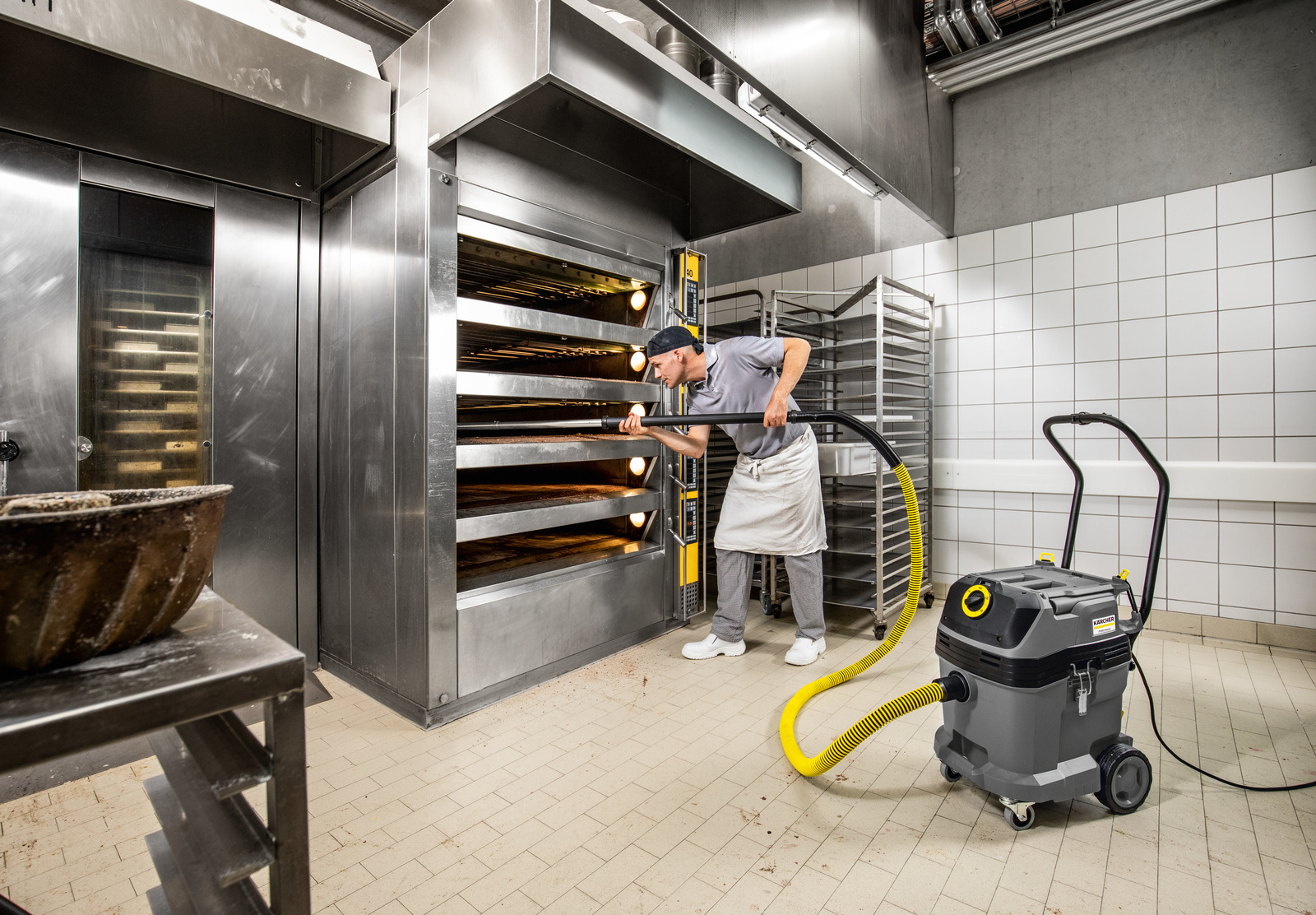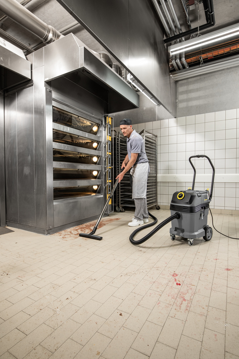 Dank unseres Bäckersaugers NT 40/1 Tact Bs können Bäcker und Konditoren aufatmen. Ob Fußböden, Maschinen oder sonstige Geräte und mit optional erhältlichem Zubehör sogar der Backofen: Der Sauger meistert mühelos alle Herausforderungen, die ihn in der Backstube erwarten. Durch seine stabilen Verschlusslaschen aus Metall ist er als explosionsfestes Gerät zertifiziert und damit auch zum Saugen potenziell gefährlicher Mehlstäube geeignet. Die automatische Filterabreinigung Tact sorgt dabei nicht nur für eine konstant hohe Saugleistung, sondern ermöglicht auch das Saugen von großen Mengen feiner Stäube. Dazu ist der Sauger mit dem mittig angeordneten Drehschalter kinderleicht zu bedienen, hält durch den robusten Behälter auch härtere Einsätze schadlos aus und ist dank des serienmäßigen, ergonomischen Schubbügels besonders einfach zu transportieren.